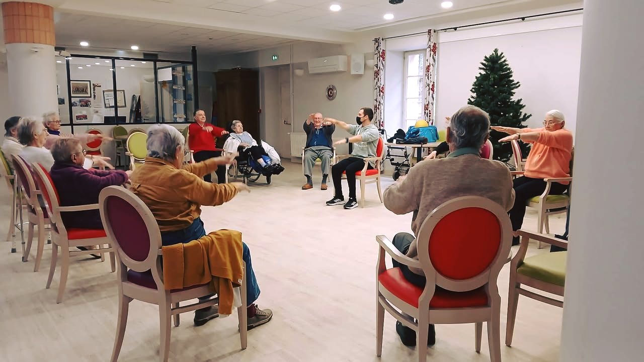 Gym douce avec Siel Bleu : un atelier qui fait du bien au corps et au moral. Un mercredi sur deux, l’équipe de Siel Bleu accompagne les résidents lors d’un atelier de gym douce.